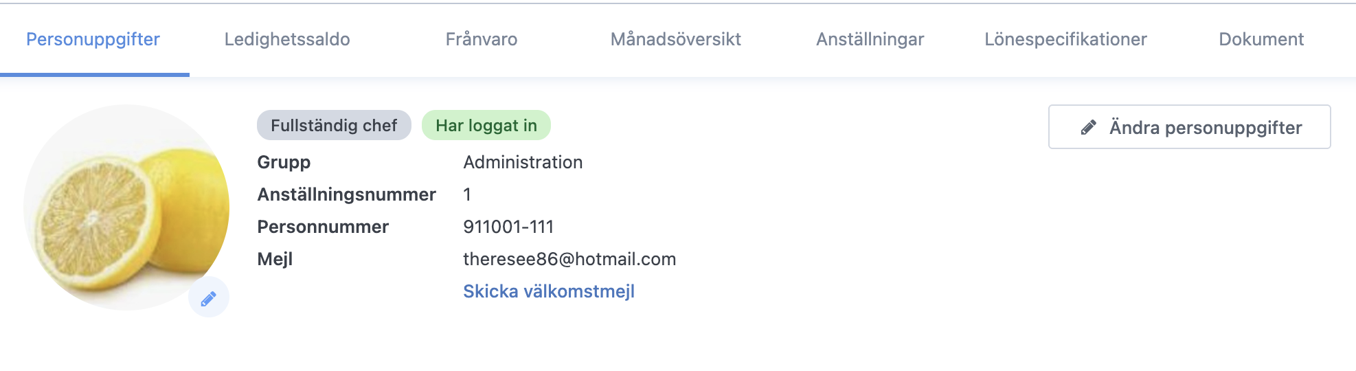 Via den första fliken på personalkortet hittar du och kan ändra den anställdes personuppgifter. Önskar du ändra några personuppgifter klicka på knappen Ändra personuppgifter. Det är även under personuppgifter som du kommer åt att göra särskilda inställningar för exempelvis skatt på individnivå. För mer information om detta läs gärna vår artikeln Inställningar på individnivå. Du kan också ladda upp ett foto på den anställda via pennan. Den anställda själv kan ladda upp en profilbild via sitt personalinlogg via webben eller vår app.