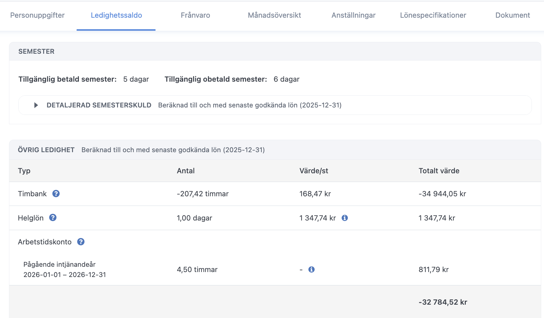 Under fliken Ledighetssaldo finns alla värden på semesterdagar och eventuell timbank, komptid, extra ledighetsdagar, helglön och arbetstidskonto för den anställda. Saldo för tillgänglig semester inkluderar även framtida registrerad semesterfrånvaro. Därför kan det skilja sig från den detaljerade semesterskulden, som visar saldot per den senast låsta lönen.