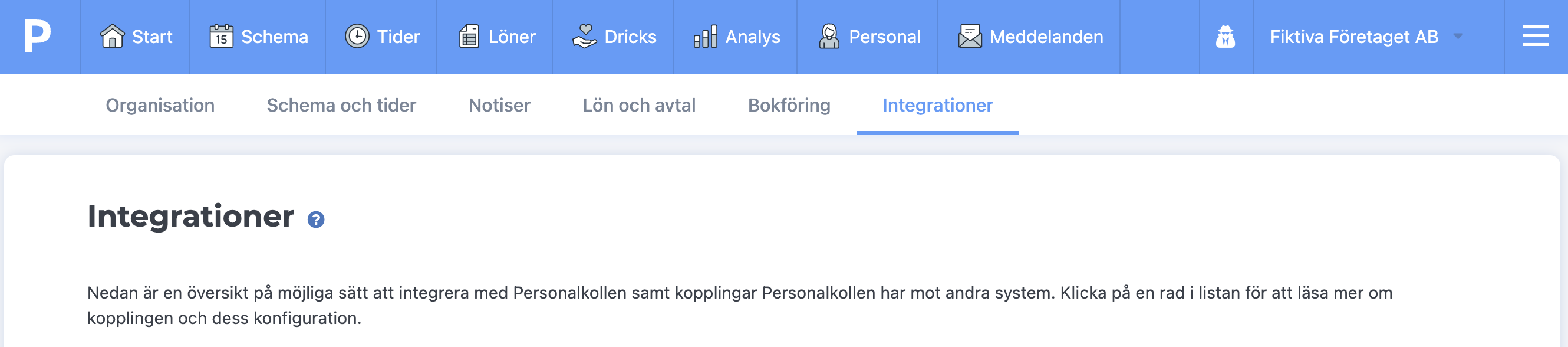 Personalkollen kan integrera mot ett brett urval av andra program. Exempelvis med din kassaleverantör, ditt bordsbokningssystem, ditt hotellsystem, Fortnox och SMHI. Under Företagsinställningar finns en samlad sida med information kring vilka integrationer som går att aktivera samt hur du går tillväga.
