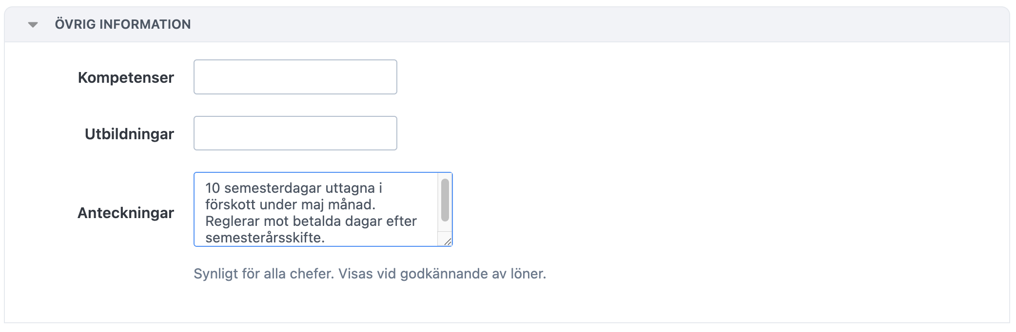 Vi rekommenderar att du antecknar när någon beviljats förskottssemester i systemet. Du kan med fördel använda anteckningsrutan som du hittar via Ändra personuppgifter - Övrig information på den anställdas personalkort. Informationen som skrivs in där är endast synlig för chefer och visas även vid godkännande av löner för denna anställda.
