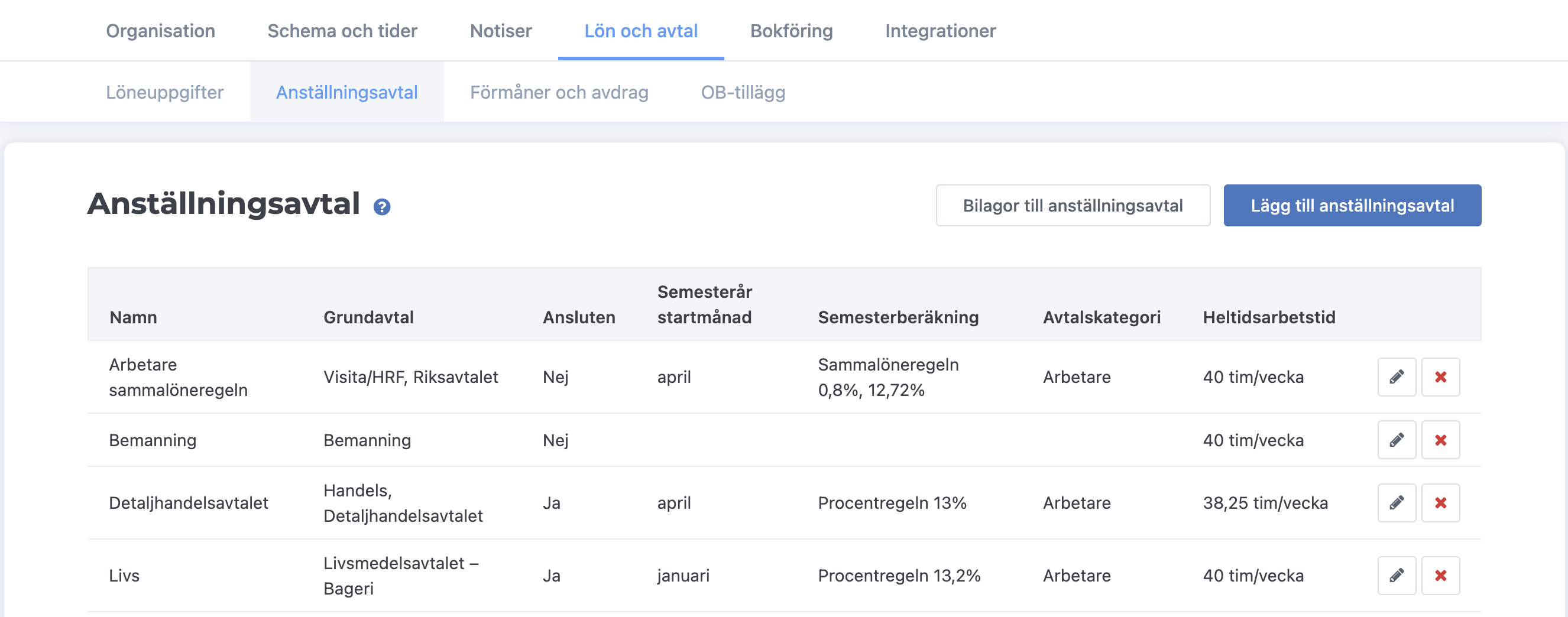 Du har möjlighet att justera semesterberäkningen enligt både procentregeln och sammalöneregeln för olika anställningsavtal i systemet. Detta gör du genom att gå till Inställningar - Lön och avtal - Anställningsavtal. Här kan du även ange om ni är kollektivt anslutna samt om du önskar få varningar om minimivärdet per semesterdag vid semesterårsskiftet.