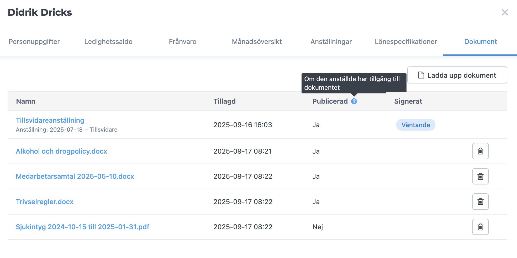 Som företagsadministratör går det att hantera dokument kopplade till de anställda. Det är möjligt att både se befintliga dokument och ladda upp nya. Vid filuppladdning kan man välja om dokumentet ska delas med den anställda eller inte. Du kan ladda upp dokument på upp till 10 MB.