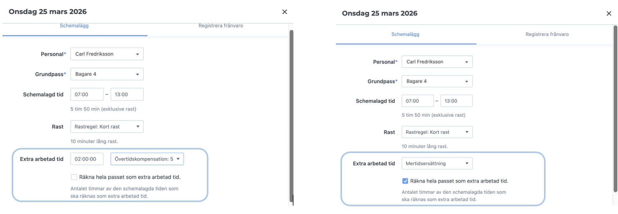Tidigare har extra tid, såsom övertid eller komptid, ofta hanterats först efter att passet är avslutat och stämplat. Nu kan du göra detta val redan när du lägger schemat. Det innebär att du på förhand kan bestämma exakt hur timmarna i ett specifikt pass ska behandlas i lönesystemet.