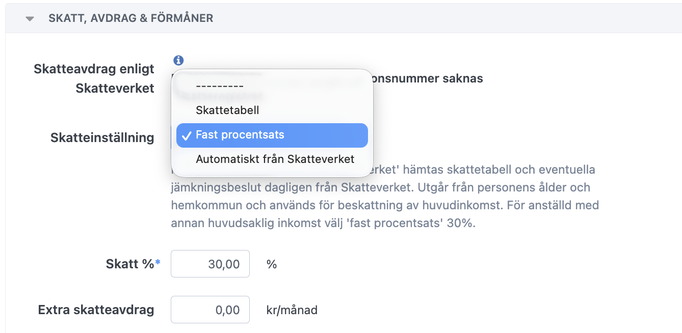 Har ni angett en skattetabell eller fast procentsats under företagsinställningarna kommer denna inställningen per default vara vald på varje person. Du kan fortfarande ändra inställning på individnivå. Läs mer om skatteinställningar i vår artikel Skatteavdrag.